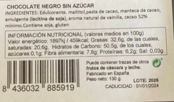 Ingredientes: Edulcorante, maltitol, pasta de cacao, manteca de cacao, emulgente (lecitina de soja), aroma natural de vainilla, cacao 52% mínimo. Contiene soja, gluten.