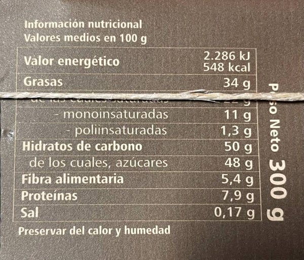 Ingredientes: Azúcar, manteca de cacao, leche en polvo del 26%, pasta de cacao, café, emulgente (lecitina de soja), esencias (café, nata, vainilla), cacao 37%.
