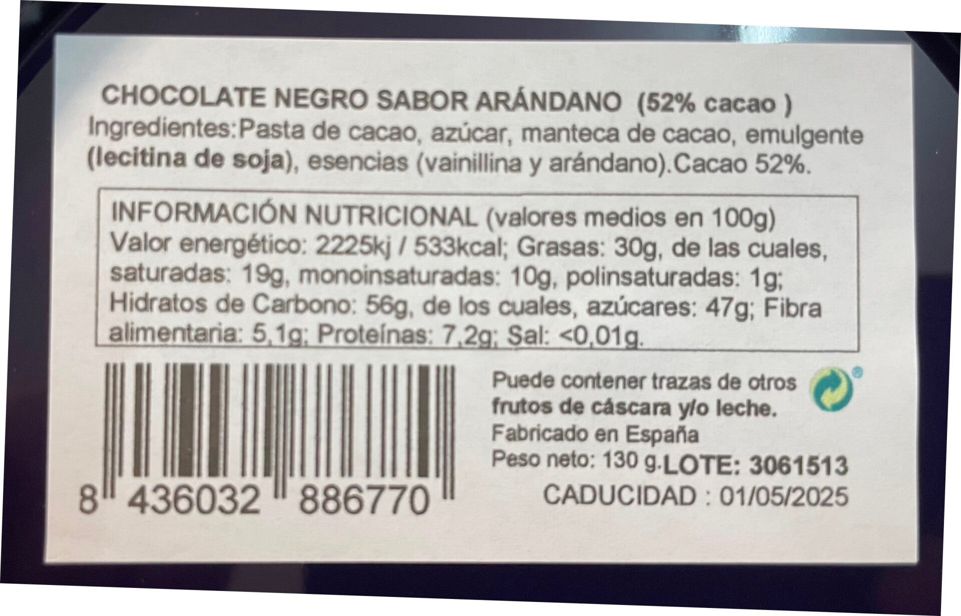 Ingredientes: Pasta de cacao, azúcar, arándanos (12%), manteca de cacao, emulgente (lecitina de soja), aromas (arándano y vainilla), cacao 52%.