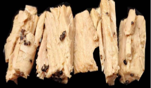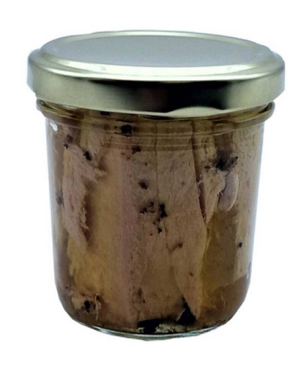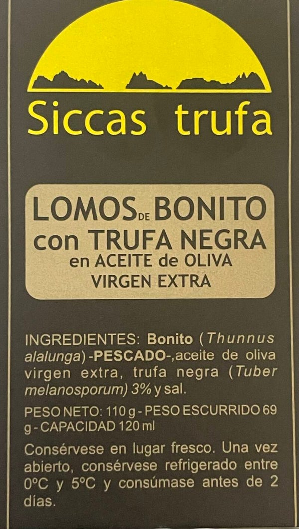 Ingredientes: Lomos de bonito [Thunnus alalunga] 70%, aceite de oliva 24%, trufa negra [Tuber melanosporum] 3% y sal.