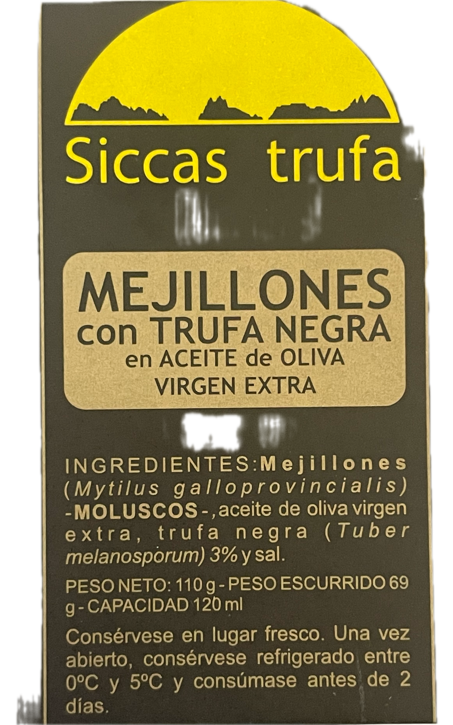 Mejillones Siccas Trufa Fritos en Aceite de Oliva Virgen BIO con Trufa Negra Tarro Cristal 110grs (Siccas Trufa)