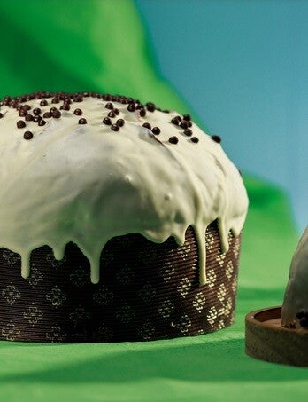 Panettone con pera confitada y gotas de chocolate, recubierto de chocolate blanco y crujientes de arroz extrudido cubiertos con chocolate (1,9%), sin pasas ni citricos confitados